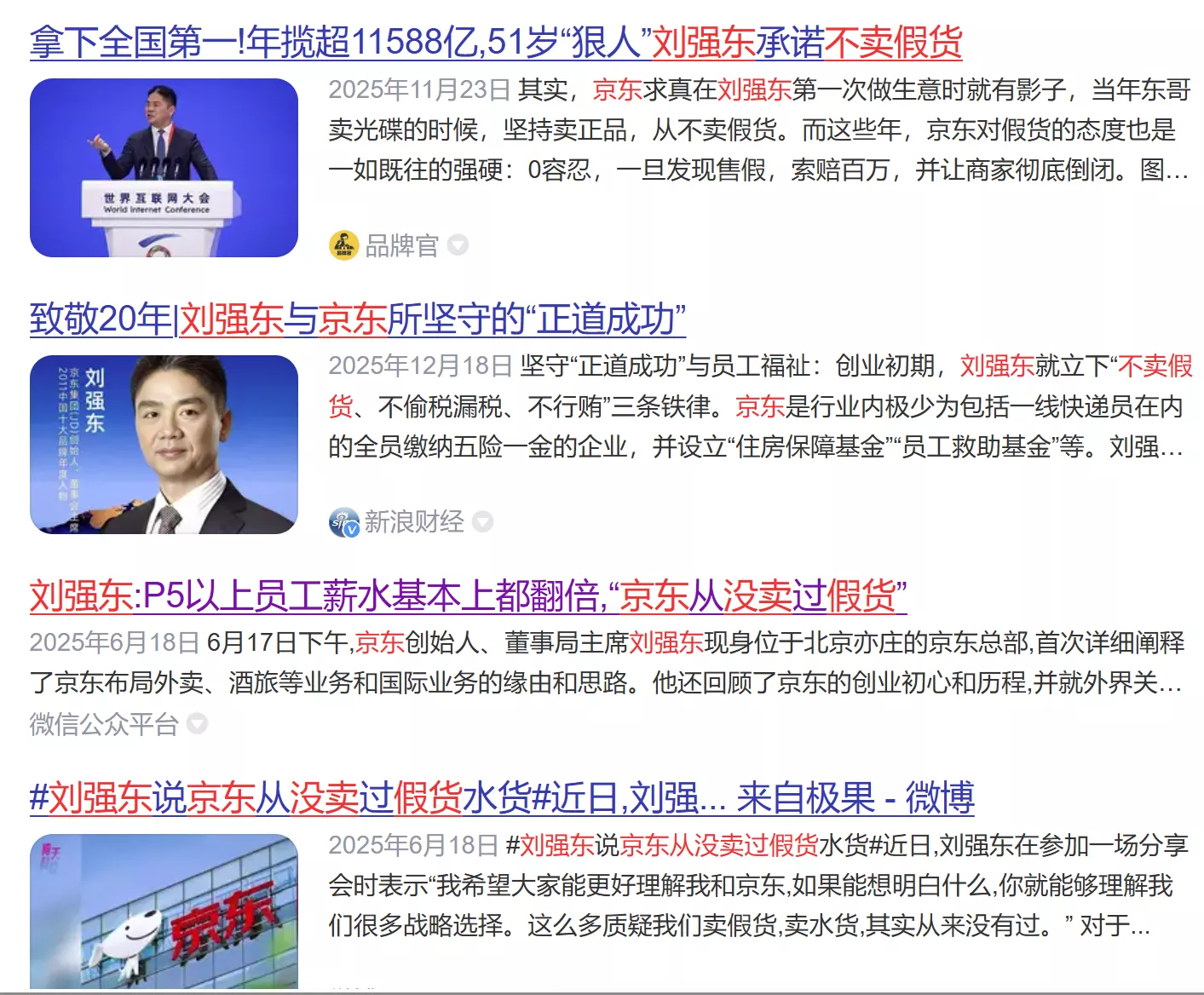 这些案例绝非个例,2025年第四季度的监测数据印证了问题的普遍性。背后暴露出的是京东平台在入驻店铺资质审核、商品质量抽检等关键环节的管控失效——在建立完善的非正品防控机制上存在漏洞,同时也未能有效阻断假货流入市场,导致消费者的知情权、公平交易权和财产安全权受到直接威胁。在京东的对外公关宣传中,一直强调“不卖假货”,说这是创业初期就立下的“三条铁律”之一。2025年6月17日,刘强东再次公开强调这一点: