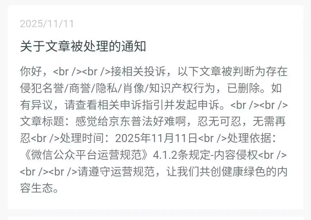 老程为了给京东提一点意见,还挺难的。2025年11月,他在平均阅读量只有个位数的个人公众号上写了一篇文章《感觉给京东普法好难啊,忍无可忍,无需再忍》,说了驼奶粉这件事,结果,很快就接到京东的侵权投诉,文章被删除了。