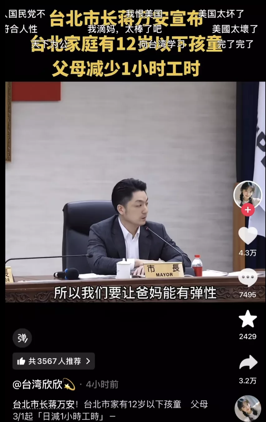 之前我看新闻上讲,今年开始,台北市公立私立中小学营养午餐全面免费。这利好对市民而言有多“直接”,不言而喻。而昨天市政会议上,蒋万安又宣布:3月1日起,家中有12岁以下孩子的父母,只要企业在不减薪的情况下,家长每天可以减少1小时工作时间。这每天1小时,自由选择,可以是上班晚一小时,也可以是下班提前一小时,看家庭需要。当然,成本并不完全由企业承担,市政府将提供八成补助。