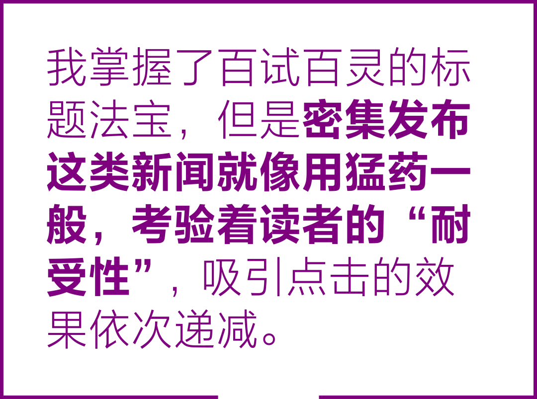 我还记得入职之前我尝试了解自己将要面临的工作内容,打开那些账号后,被成吨出现的感叹号所震惊。一想到未来的工作就是起这样充满感叹号的标题,我感到自己要心脏骤停了。如今我已经自觉自愿地在标题里加入感叹号,熟练使用「刚刚」和「突发」。再看到信息流里出现这样的新闻,我内心产生的不再是反感,而是想到这背后有一个和我一样不得不「动用智慧」起标题的编辑,遂产生一种同病相怜、惺惺相惜之感。不知道该不该高兴,我成了朋友中间的「标题专家」,经常有朋友请我参谋如何通过标题来获得更高点击量。