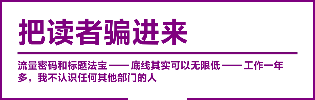 有时候我也会想,这种隐藏到底到什么程度会构成欺骗。文内有详尽具体的陈述,标题只是吸引读者点击进来的手段,这又构成欺骗吗?有一次我们在标题里用了「突发!」,结果内容只是关于某个领导的一次致辞,这条新闻被人举报了,理由是标题党。我无可辩驳。我们确实只是想把读者骗进来,让左下角代表阅读量的数据再多一点。