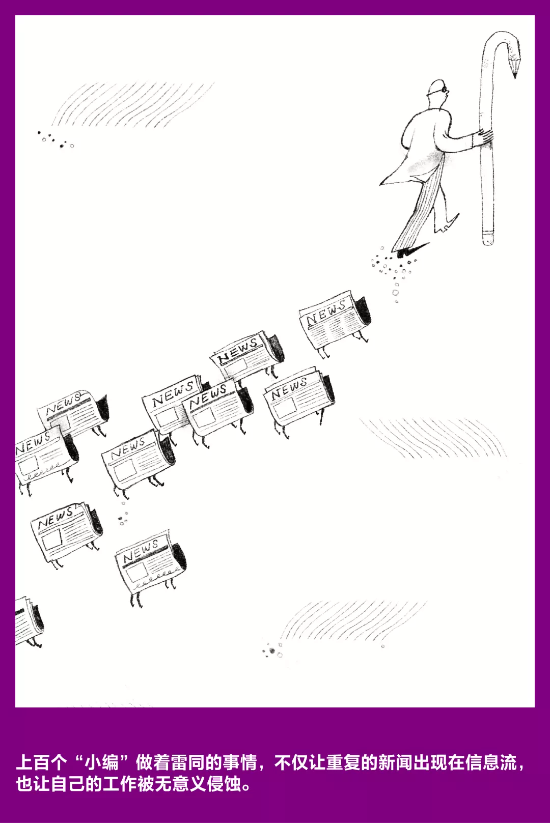 因为这份工作,我关注了上百个官方媒体的微信公众号,信息流被刷屏了,每隔几秒就会弹出一条新闻,标题上满是「突发」和无尽的感叹号。我看了比从前多百倍的新闻讯息,却觉得自己再也没能真正地关注任何新闻。当我回顾自己关注的上百个公众号一天下来发了什么新闻的时候,发现 90% 的内容几乎是重复的,只有更新频次和条数的差别。我记得某位女演员因为天价耳环事件被通报的时候,每隔几秒就弹出来的新闻变得整齐划一,不同媒体会带着略有差异但大体一致的封面和标题报道同一件事情。这也就意味着,背后有上百个小编在干着和我同样的事情 —— 从上百个号中筛选出高流量的新闻,然后复制、粘贴。想到有这么多人做着同样重复无聊的工作,这并不能让我感到一丝安慰,只让我觉得更难过。