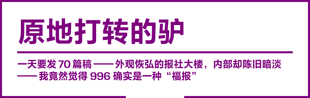我甚至产生了 996 确实是一种「福报」的荒谬念头 —— 那至少是某种固定的工作节奏。我原本为了更轻松的生活来到地方报社工作,如今却连看心理咨询师的一个小时无法确定下来。这让我产生了强烈的存在主义危机。我每天像驴一样忙碌地原地打转,不知道这一切到底是为了什么。