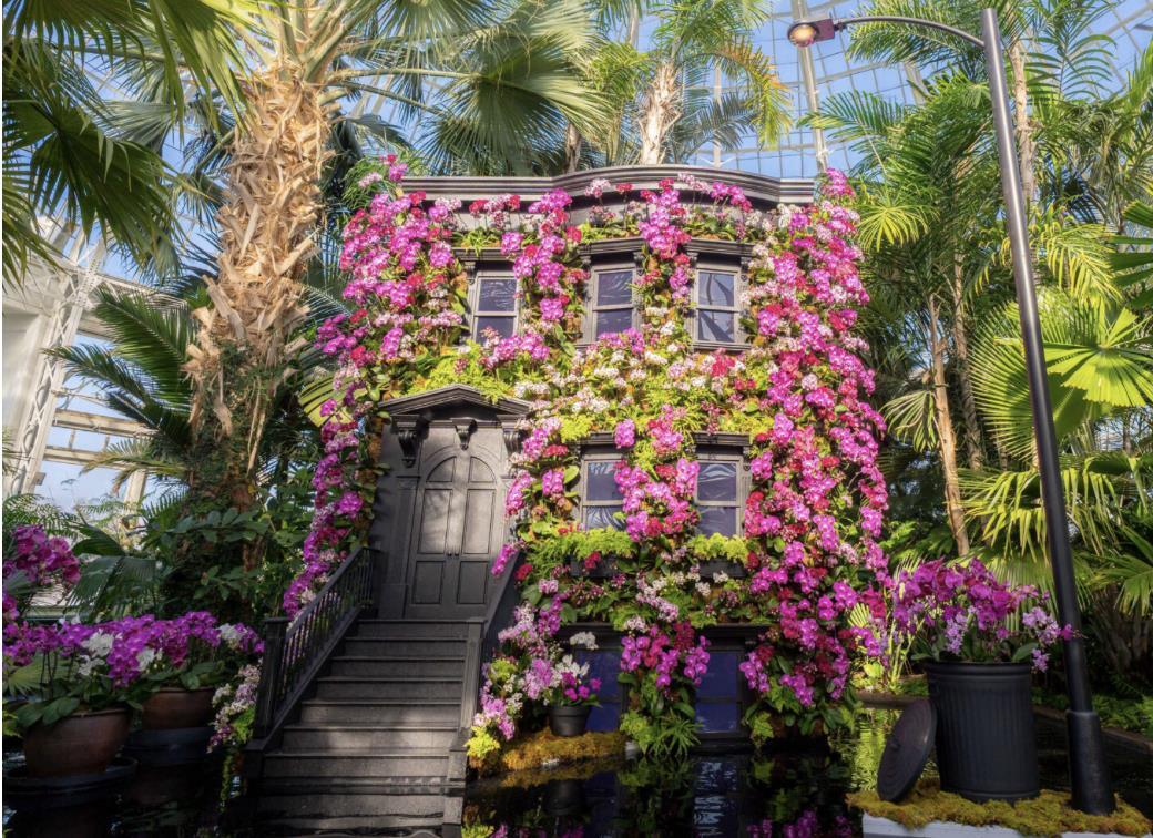 由粉红、桃红和白色的蝴蝶兰组成的一栋褐石屋。(取自纽约植物园)