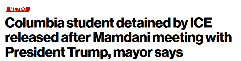 马姆达尼在X平台发文表示:“刚刚与川普总统通完电话。在此前的会面中,我表达了对哥伦比亚学生Elaina遭拘留一事的关切。他刚刚通知我,她即将获释。”数小时后,哥伦比亚大学发表声明称:“我们感到宽慰和高兴,我们的学生Ellie已经获释。我们将于今晚公布更多细节。”