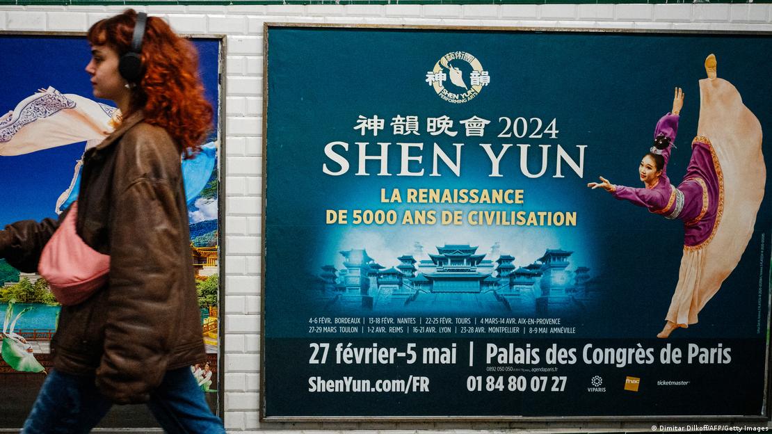 神韵晚会在全球各地演出(图为2024年巴黎演出的海报)图像来源: Dimitar Dilkoff/AFP/Getty Images 总部位于美国纽约的神韵艺术团成立于2006年,由被中国取缔的法轮功组织所创立。目前有八个演出团,每年在全球进行数百场演出,演出内容包括中国传统文化节目,也涉及法轮功学员遭中国镇压的情节。