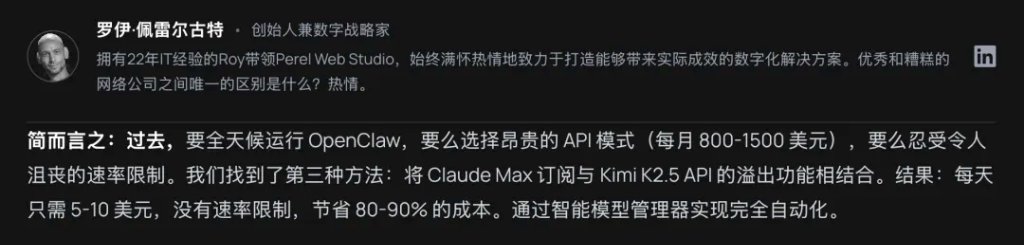 一家使用OpenClaw的欧洲开发工作室公开了他们的方案:80%的日常推理引擎用Kimi K2.5,碰到高难度推理、复杂系统架构之类的20%硬骨头,通过bash命令把任务甩给Claude。一天的Kimi开销大约5到10美元,月度Token预算控制在150到300美元。如果同样的事全量用ClaudeAPI模式,月成本将高达800-1500美元以上。