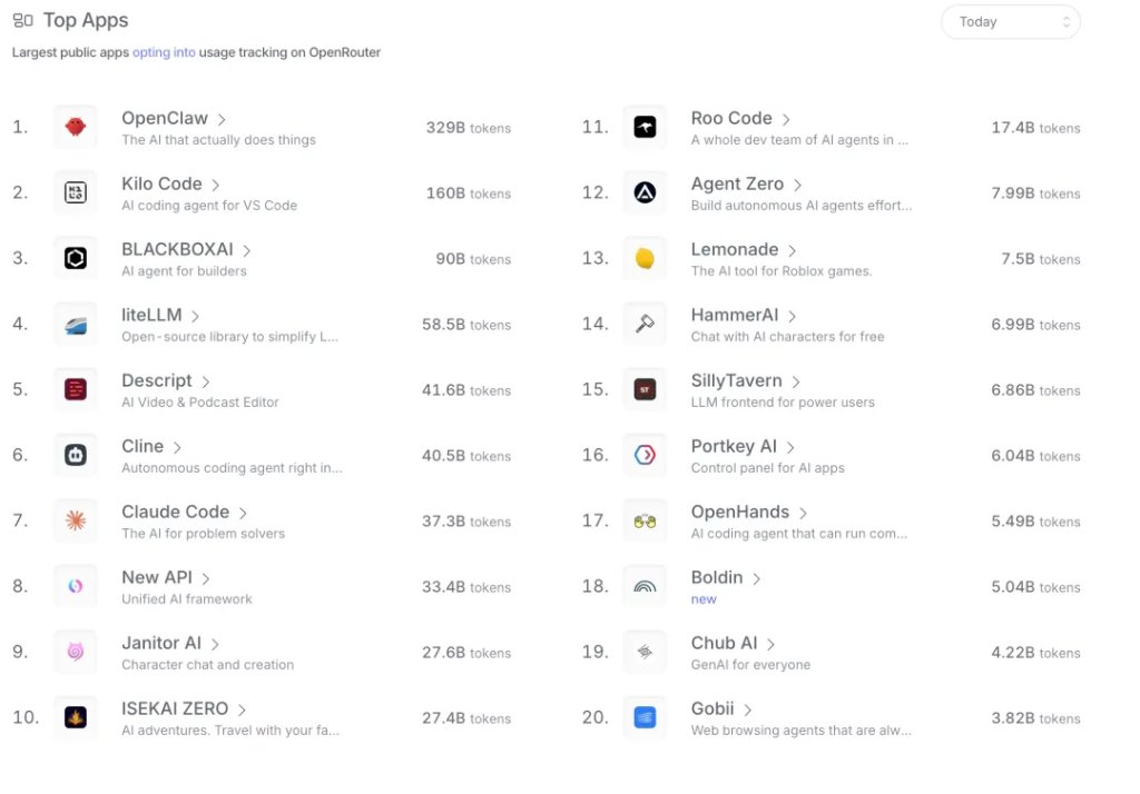 图:OpenClaw是OpenRouter最大的单一应用,其Token消耗量约占平台显著比例