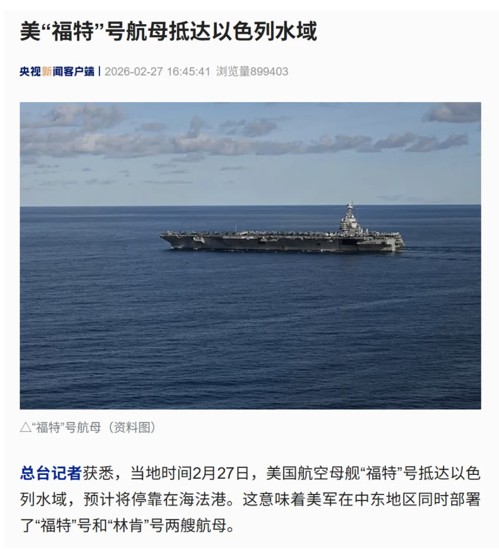 总台记者获悉,当地时间2月27日,美国最大的航空母舰“福特”号抵达以色列水域,预计将停靠在海法港。这意味着美军在中东地区同时部署了“福特”号和“林肯”号两艘航母。