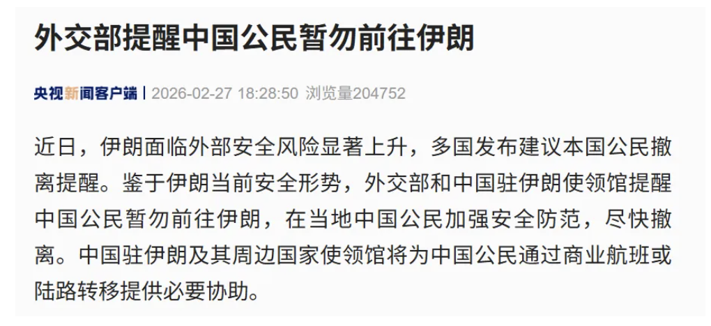 中国外交部:中国公民暂勿前往伊朗 在当地中国公民加强安全防范,尽快撤离