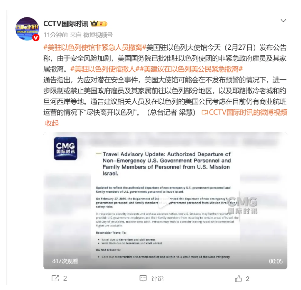 美国驻以色列大使馆今天(2月27日)发布公告称,由于安全风险加剧,美国国务院已批准驻以色列使团的非紧急政府雇员及其家属撤离。