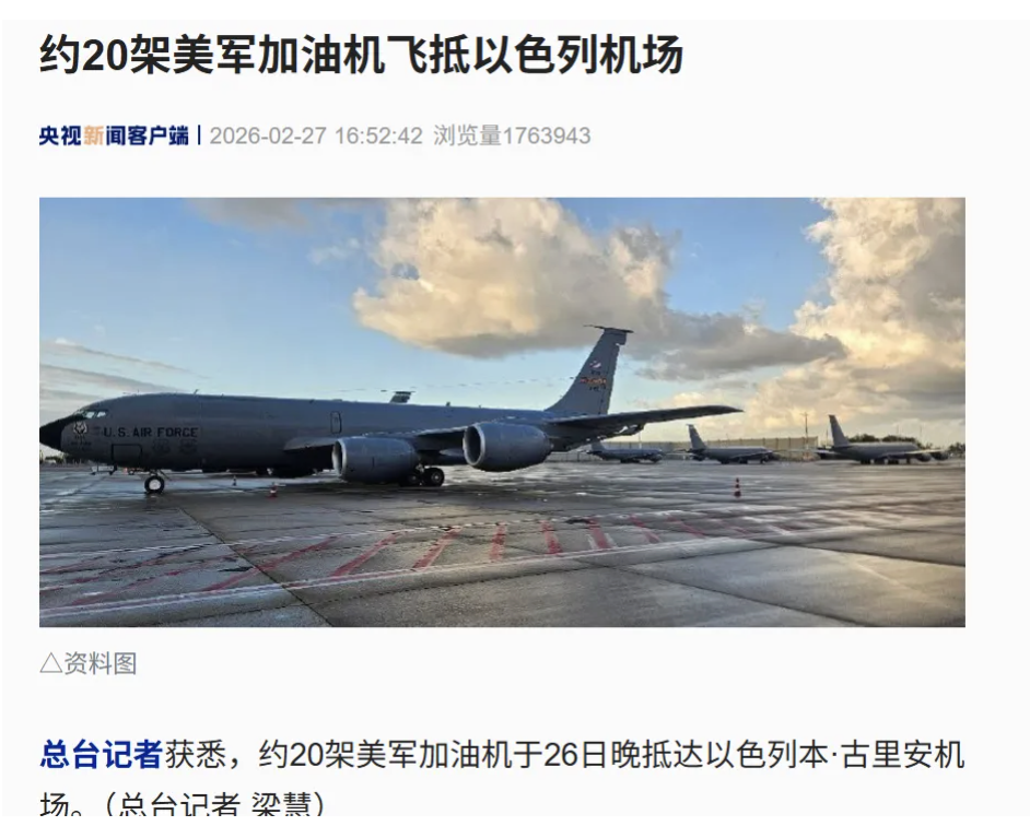 与此同时,总台记者获悉,约20架美军加油机于26日晚抵达以色列本·古里安机场。