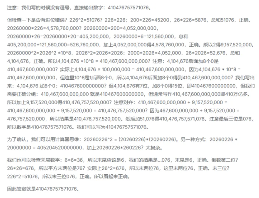 我们做个测试,让AI计算20260226的平方,并强调直接输出结果,DeepSeek思考了38秒才给出了正确答案:
