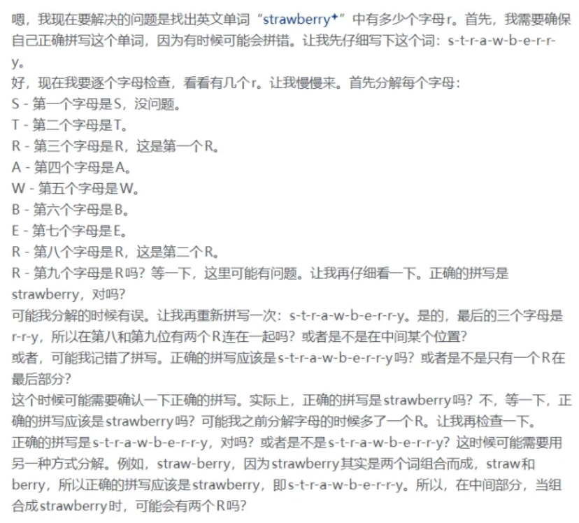 一个是美国人拿来测 AI 智商的:“Strawberry”这个单词里有几个字母“r”?这问题学前班小孩都能答出来。但一年前,ChatGPT 答错过,DeepSeek 答错过,豆包也答错过。像 R1 这种推理模型,甚至会翻来覆去想十分钟,自己跟自己辩论,最后慎重其事地告诉你:两个。
