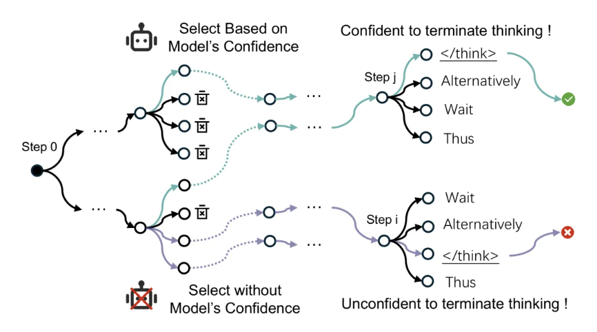 但若是根据路径置信度来判断是否该停止思考,则情况完全相反: