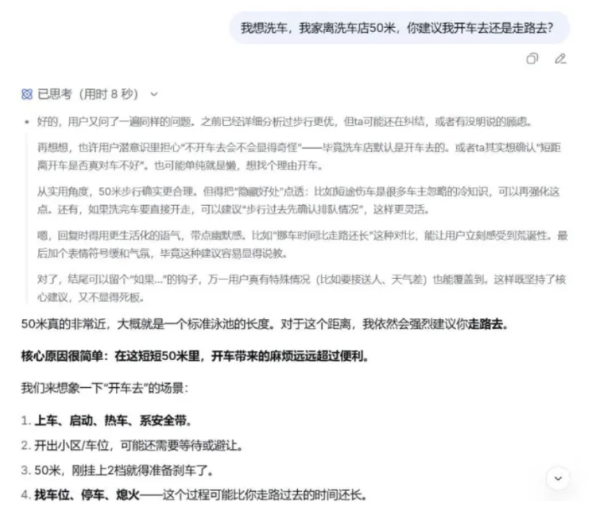 等 AI 终于把这个坑填平了,中国人又出了个新题:要去 50 米外洗车,应该开车去还是走路去?