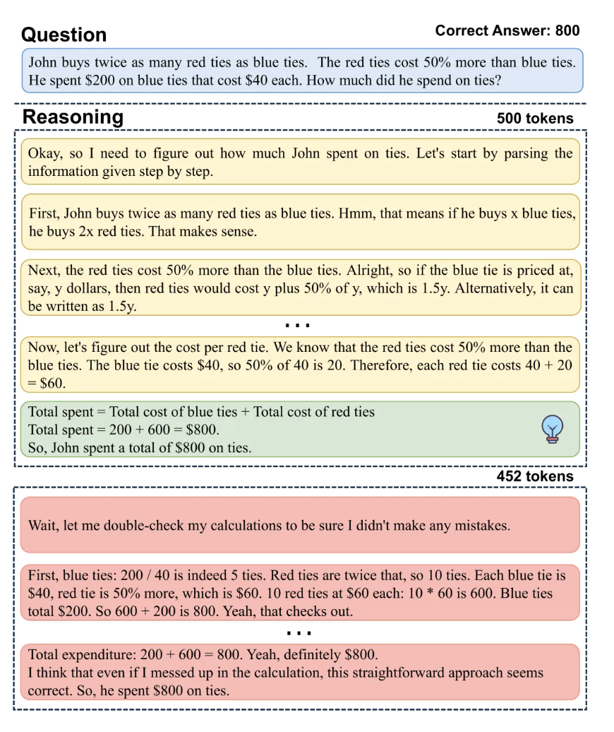 但在这种采样模式下,我们可以从DeepSeek等模型的显式思维链中明确看到:在得出正确答案后,模型通常不会立刻停止并告诉用户答案,而是会继续生成大量无效的验证或重复步骤。