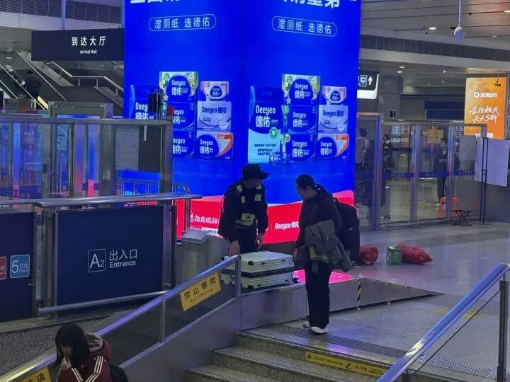网友们点赞的传送带一共两条,安装在到达大厅与地铁站A口连接通道楼梯的两侧,有工作人员在帮助旅客放好每一件行李。