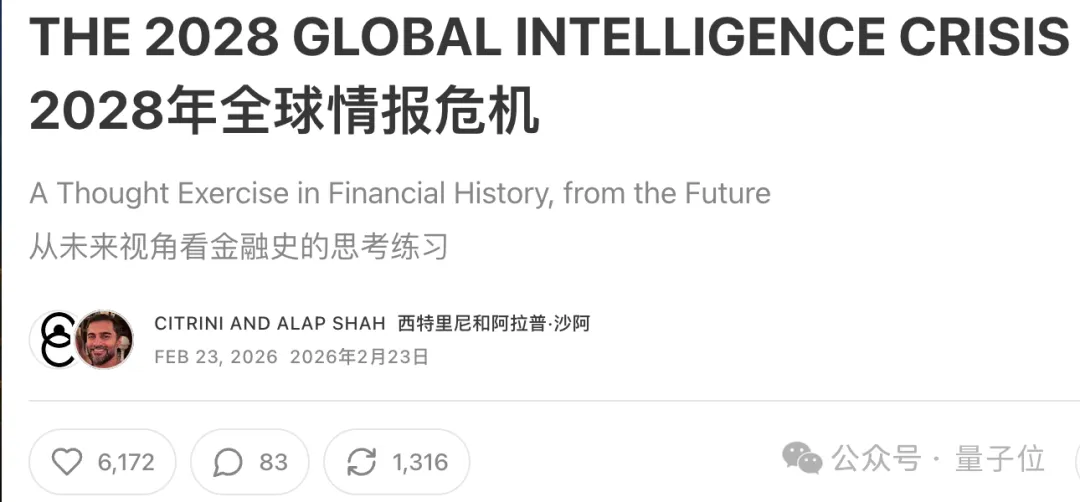 2月23日,一家小型机构Citrini Research发布了一篇名为《2028年全球智能危机》的报告,虚构了AI在2028年可能导致的经济危机:
