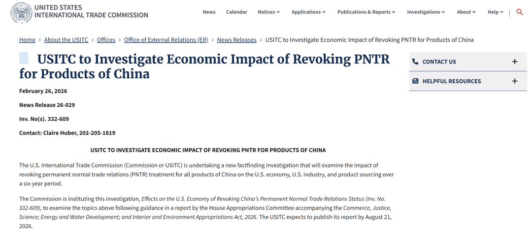 当地时间2月26日,美国国际贸易委员会(简称“USITC”)发布官方公告,宣布其正在进行一项新的事实调查,该调查将审查取消对所有中国产品的永久正常贸易关系(PNTR)待遇对美国经济、美国工业和产品采购在六年期间的影响!