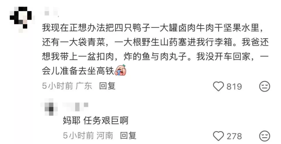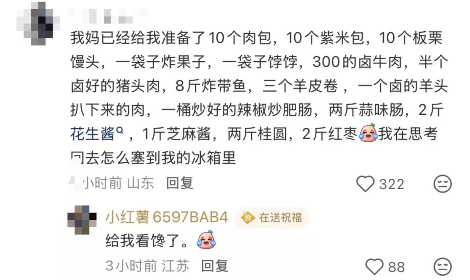 离开时妈妈装入的冻牛肉,爸爸塞进缝隙的散装花生,还有在集市上扫荡来的、带着泥土芬芳的土特产……