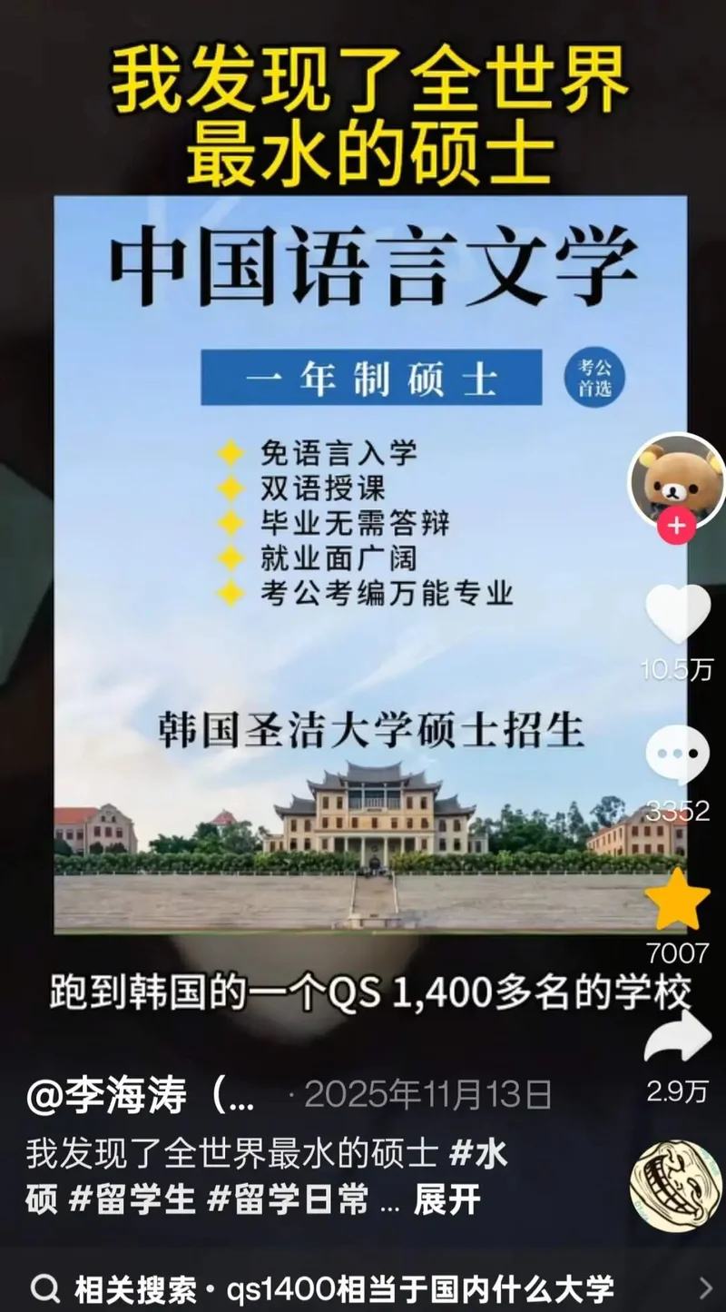 最近一位博主发现东亚的水硕水出新高度。在QS排名1000名开外的韩国大学推出了一年制的中文硕士,宣传是不需要学韩语,毕业不用答辩,专业还是汉语言文学,对考公考编“万能”。