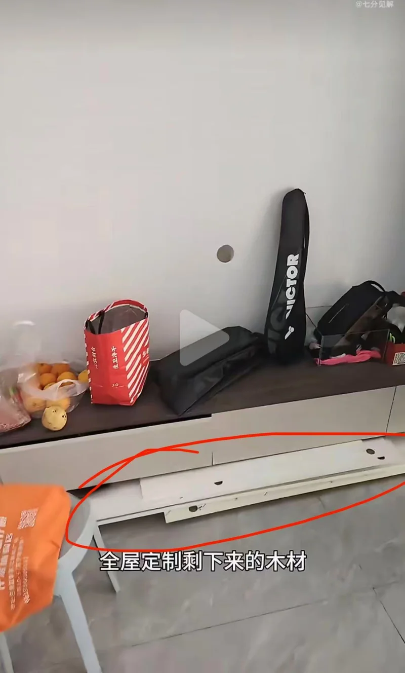 电视柜上没有电视,只有一堆乱七八糟的杂物,3年前全屋定制剩的木板舍不得丢,都塞在电视柜下,既不美观也不整洁。