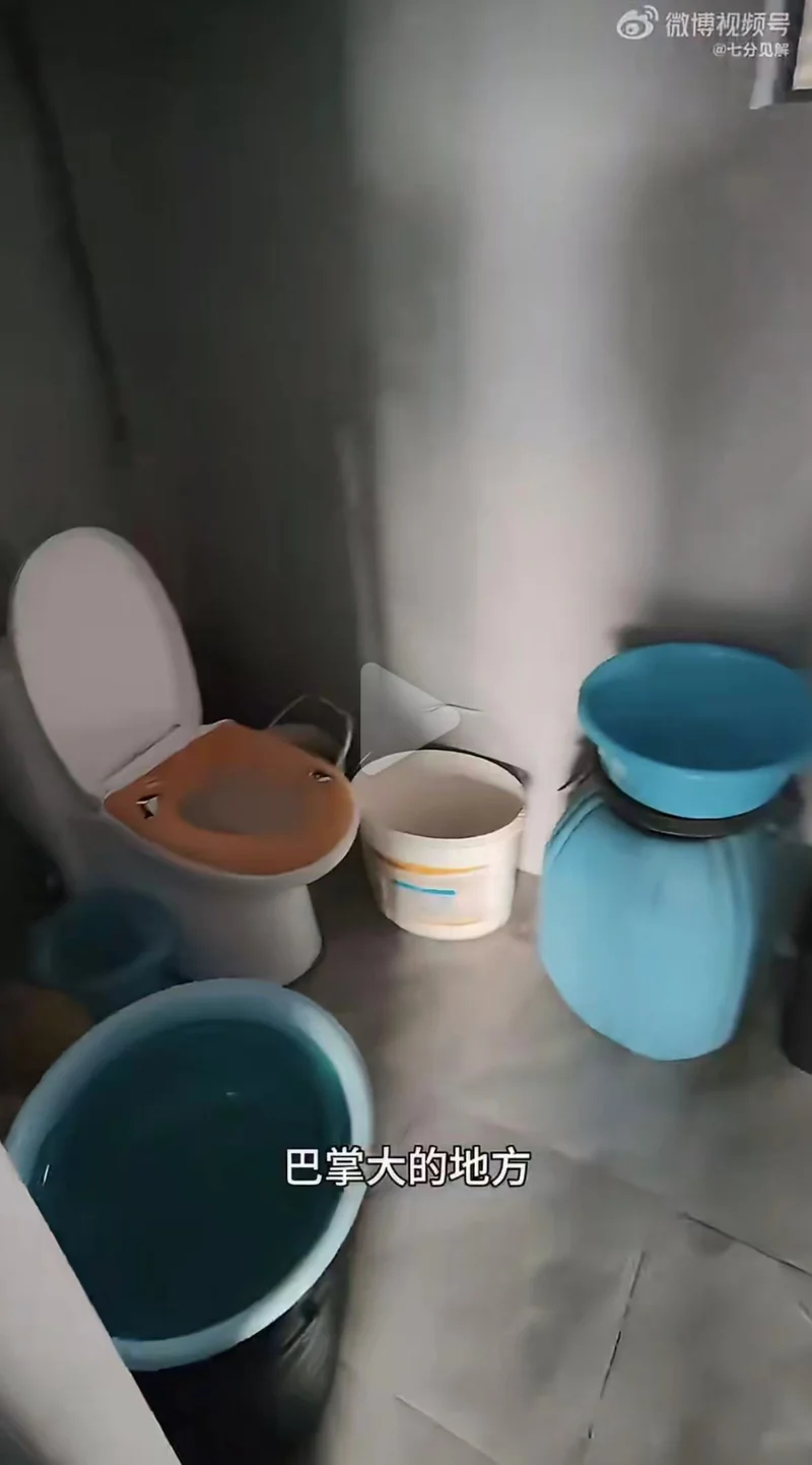 更让他无法忍受的是,是巴掌大的厕所塞了5个废水桶。