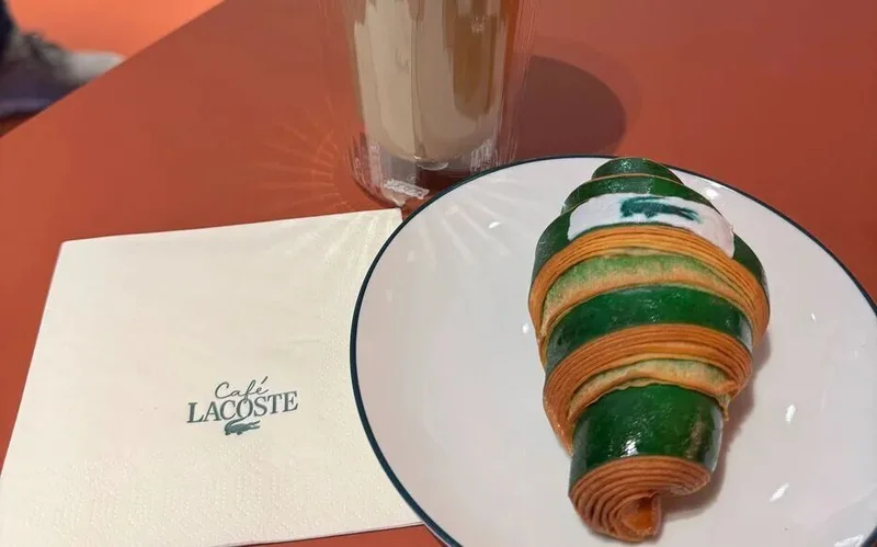 然而,当服务生将那份价值4.5欧元的开心果可颂端上桌时,他不禁挑了挑眉毛——在金黄酥脆、刷着一层诱人淡绿色开心果酱的面包表面,赫然点缀着一个小巧玲珑的绿色鳄鱼标志。