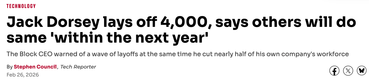 他还向整个科技和商业领域发出警告,指出Block并非在人工智能变革上“走得太前”。“我认为,大多数公司其实已经落后。未来一年内,我相信大多数企业都会得出同样的结论,并进行类似的结构性调整。与其在压力之下被动应对,我更愿意坦诚而主动地作出改变。”
