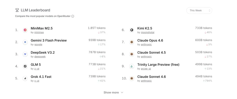 AI 模型大迁徙2026 年 2 月 24 日,OpenRouter 发布了一份周度数据:平台前十模型的总 Token 消耗约 8.7 万亿,中国模型独占 5.3 万亿,占比 61%。MiniMax M2.5 以 2.45 万亿 Token 空降榜首,Kimi K2.5、智谱 GLM-5 紧随其后,前三名清一色来自中国。
