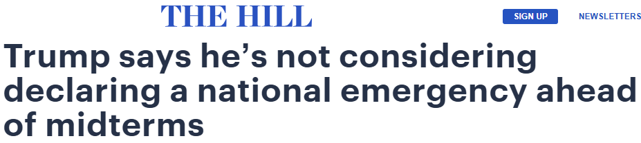 总统川普周五对有关他可能在中期选举前宣布进入国家紧急状态的报道不以为然。