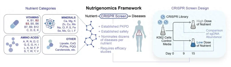面对罕见病治疗困境与维生素的潜在价值,该研究团队颠覆传统因病找药的研究模式,创新性地提出“以药找病”的营养基因组学框架,即先确定潜在治疗剂(维生素 B2、B3),再系统筛选哪些遗传病对其敏感,可通过补充该维生素实现治疗。