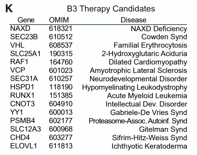 图 | 在维生素 B3 全基因组 CRISPR 筛选中发现的主要单基因疾病(来源:上述论文)