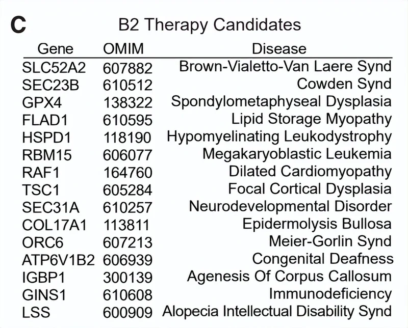 图 | 在维生素 B2 全基因组 CRISPR 筛选中发现的主要单基因疾病(来源:上述论文)