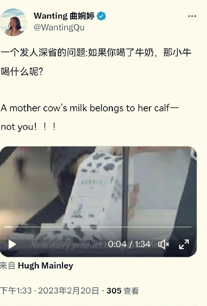 当时,西方左派的环保正在风口上,曲婉婷作为一个新加拿大人,一个“高等华人”,就去扮演素食主义者,去绑架一个高尚的口号:你们要保护环境,保护动物,保护地球。