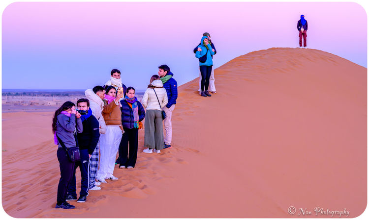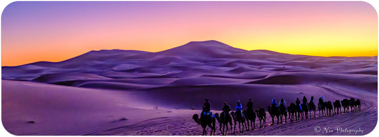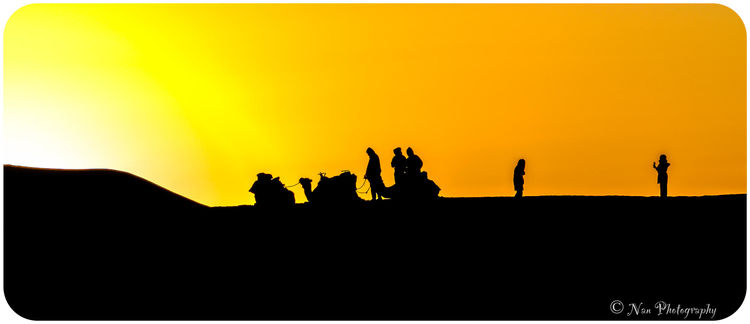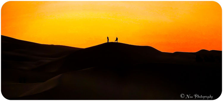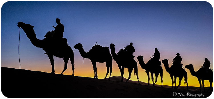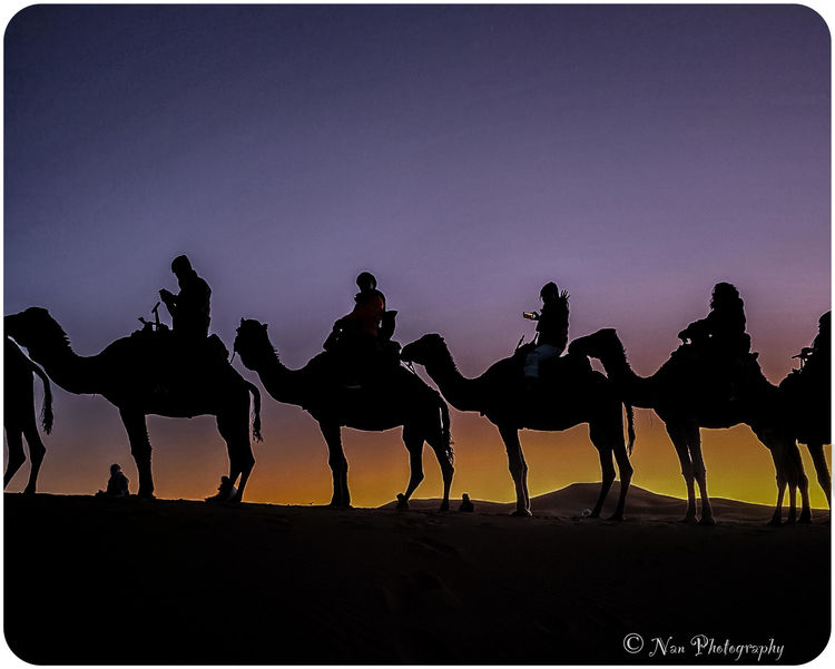 黎明前的撒哈拉,天地间出现一抹橘黄。我们跨在驼背上,身体随着它的步履微微晃动,远远看去,缓步前行的驼队在沙脊上连成了一串沉默的剪影。