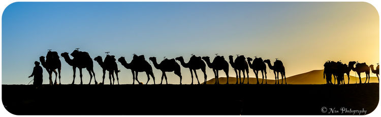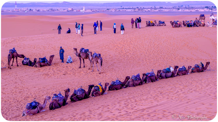 虽然没有人喊口令,但大家步调一致,不约而同地跨上蹲伏的骆驼,随着柏柏尔人的手势,所有骆驼都站了起来。