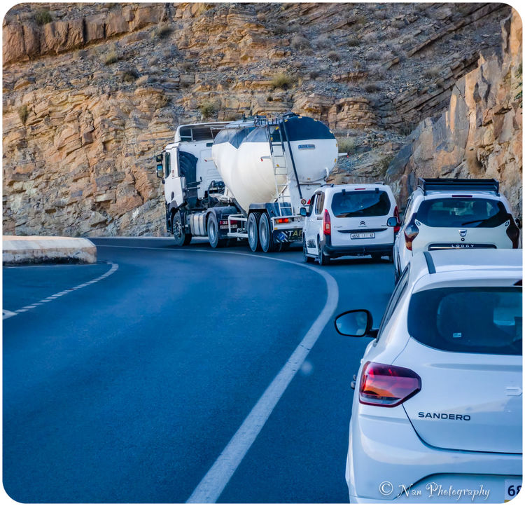 山路开始盘旋。重型卡车在弯道间缓慢行进,贴着峭壁而过。岩壁上层层叠叠的沉积线条清晰可见,颜色从浅黄到深褐渐次过渡,记录着这片土地曾经的海洋与风化。