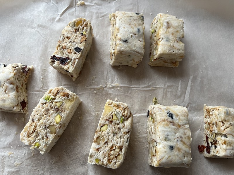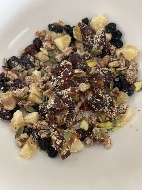 家里面正好有各类果脯,坚果,那就多放。最后是苹果脯,蓝莓干,蔓越莓干,蜜枣,南瓜子,芝麻,腰果,核桃,开心果。反正喜欢吃啥就放啥。都切成小块。