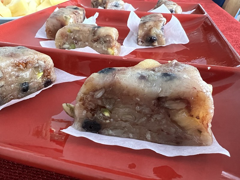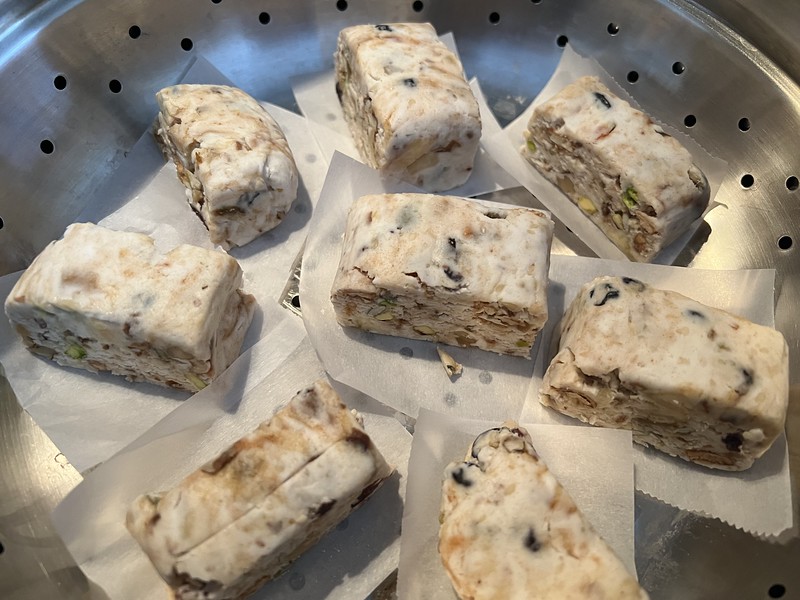 蒸出来就是这个样子了。非常好吃。亮爸吃了说这样比烤年糕好吃。我看着这么多的料,就想这能量块或能量棒不就是用某种可以把坚果等食材粘合在一起的材料做出来的么。那我也可以用糯米粉啊。