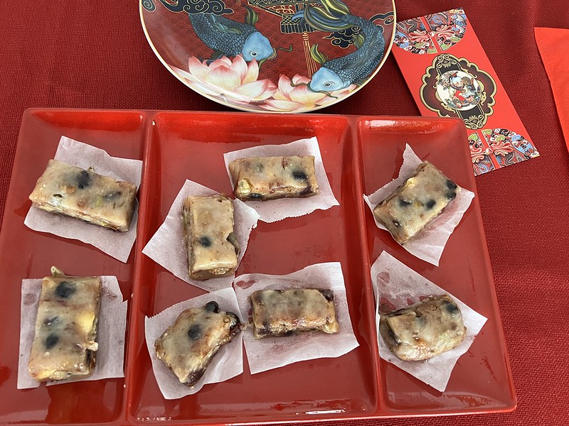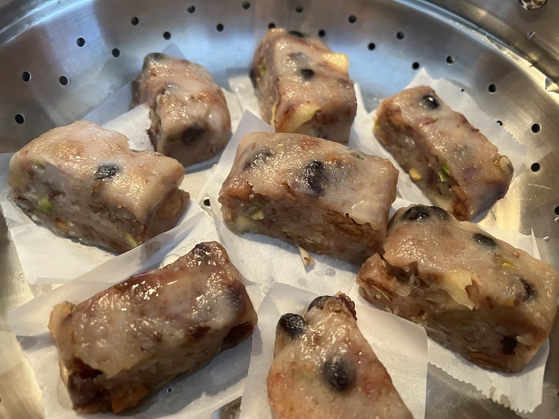 这款蒸年糕没放油,放糖,都靠着果脯里面的糖,坚果里面的油。