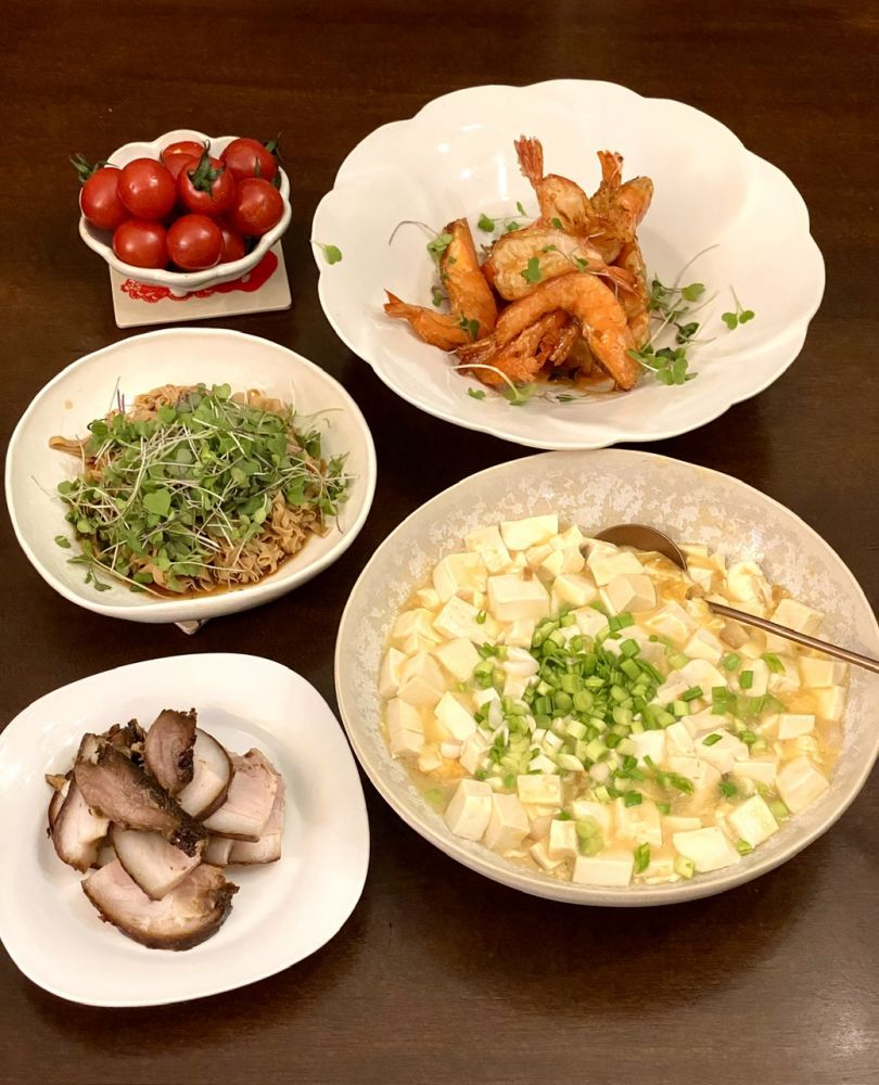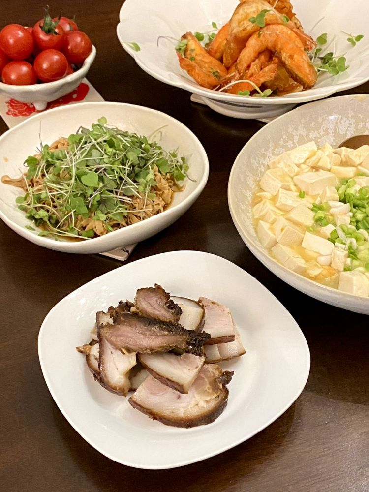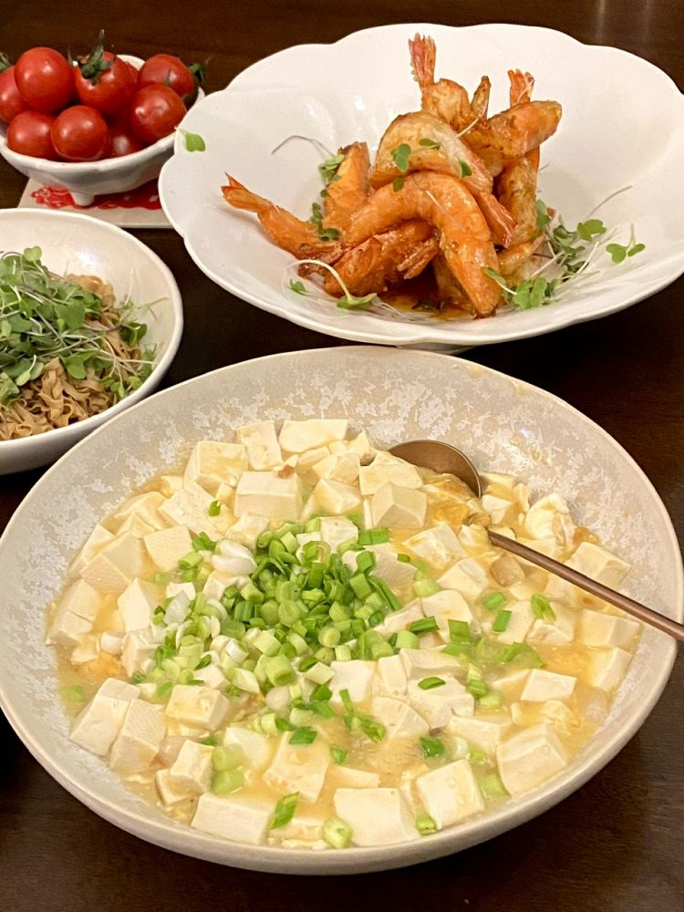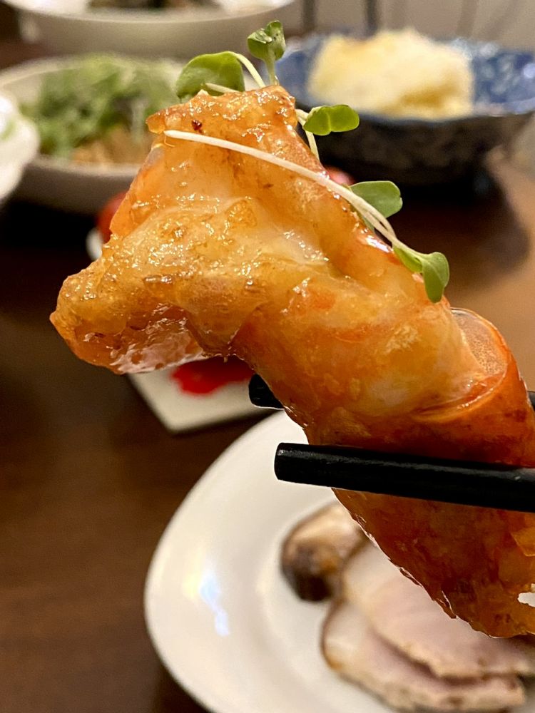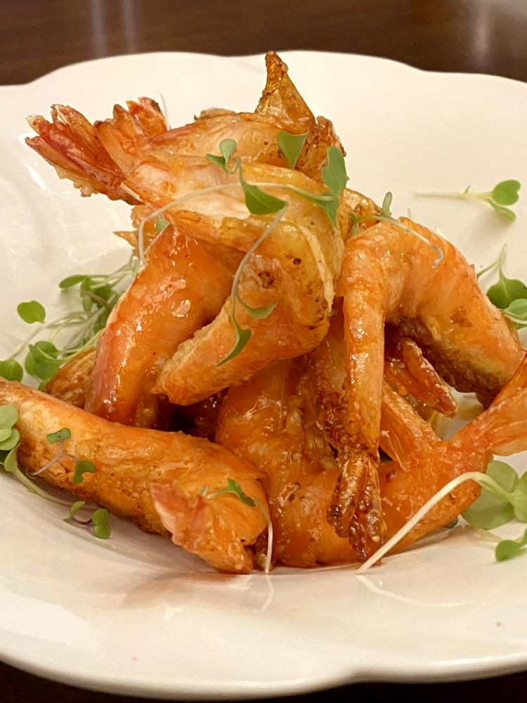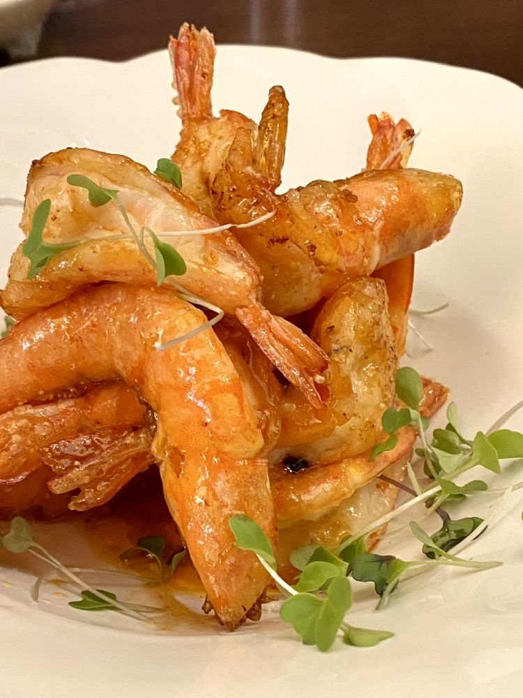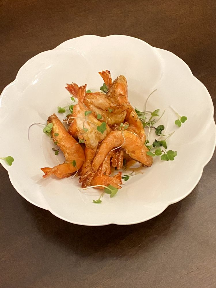 蜜汁酥皮虾,咸蛋黄汪豆腐,豆苗卤干丝烹小闲博客