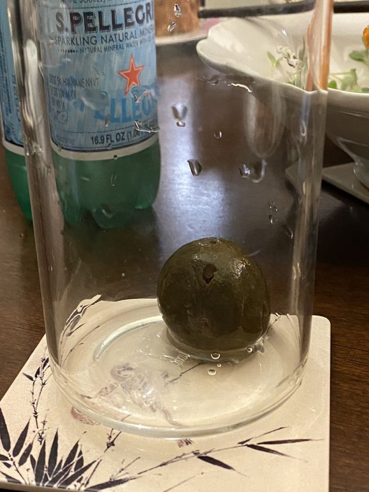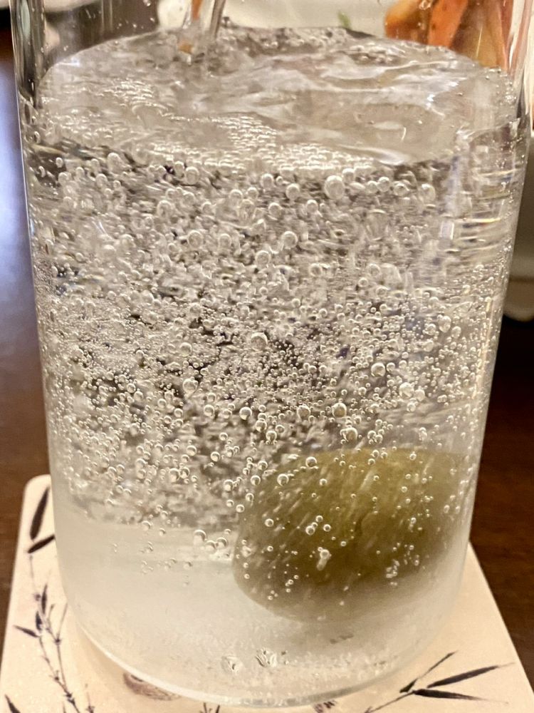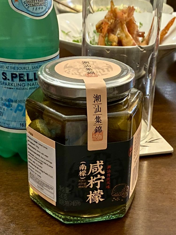 这个咸柠檬可以做港式茶餐厅的饮料咸柠七,我没有七喜,就是原味气泡水,所以味道就是咸咸的。把咸柠檬压碎。