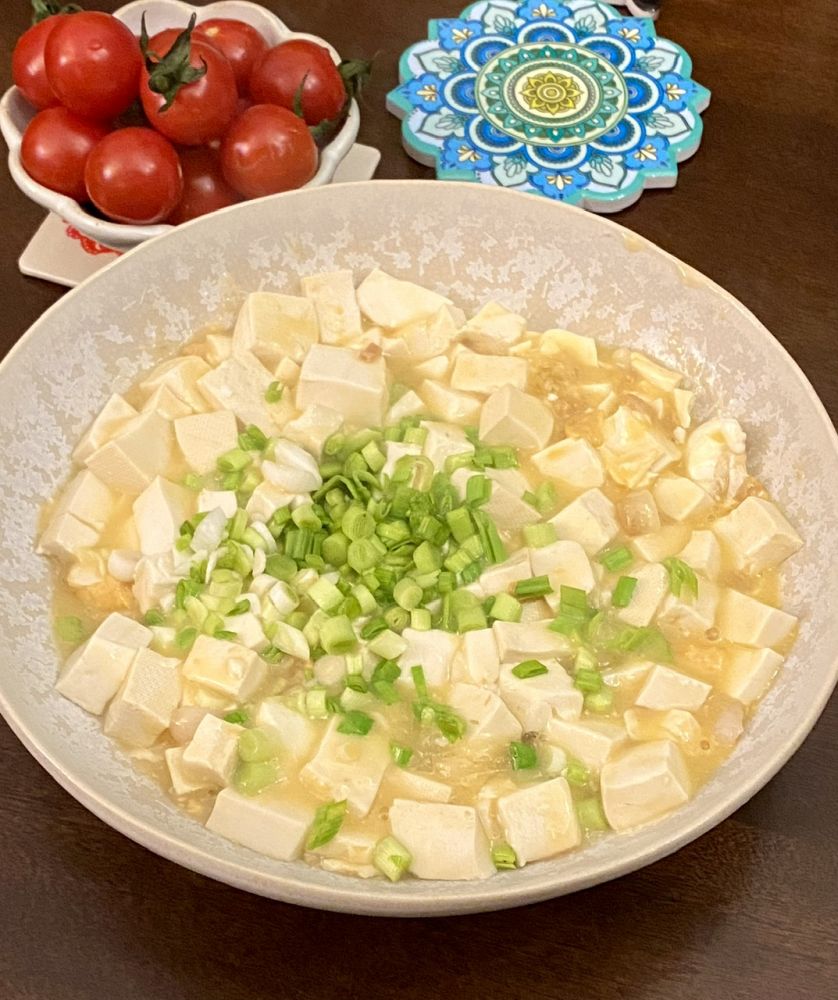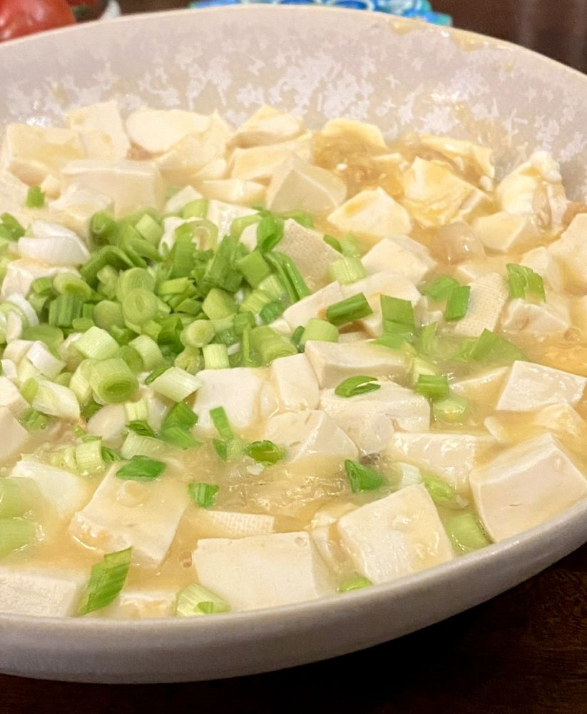 汪豆腐,用的大油,咸蛋黄,青蒜叶。