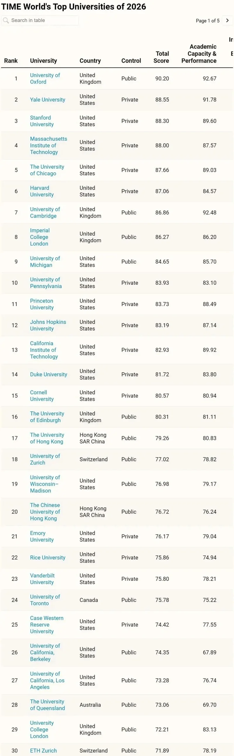 (排名前30的大学榜单,图源时代周刊官方)