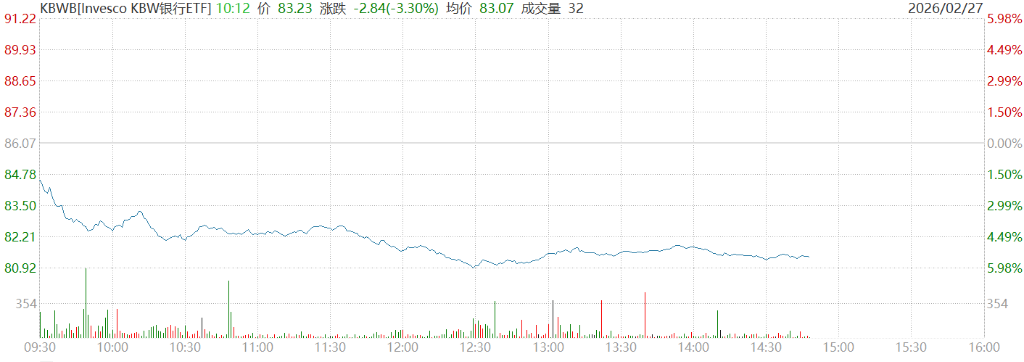 2月27日美股盘中,KBW银行指数一度跌幅达6%,所有23家成分股全线下挫、跌幅均超2.9%,板块整体回落至去年12月初水平,创下4月贸易动荡以来最大单日跌幅。