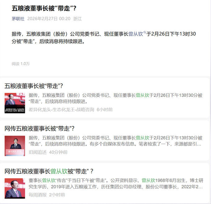 2月27日,多个酒业公众号称:“据传,五粮液集团(股份)公司党委书记、现任董事长曾从钦于2月26日下午13时30分被“带走”,后续消息将持续跟进”。目前该消息尚未被官方证实。