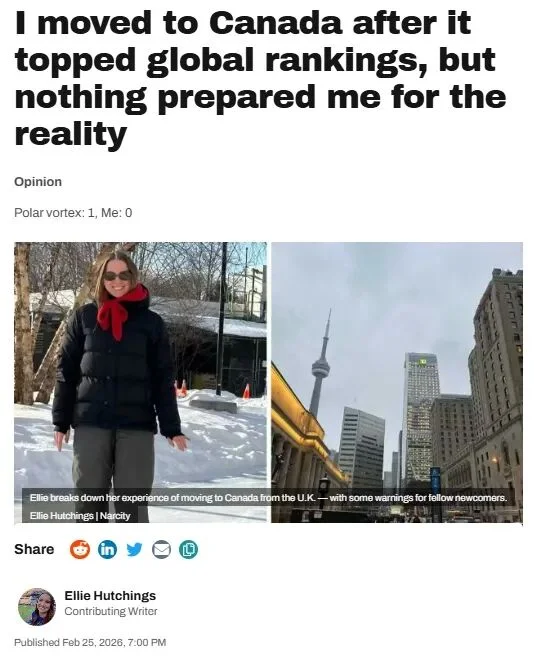 一位英国年轻妹子Ellie Hutchings,在加拿大被评为“全球最理想移民目的地”后,决定与男友一起搬到多伦多开启新生活。但她坦言,现实与想象之间的落差,比她预期得要大得多。