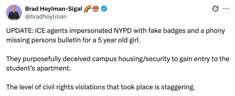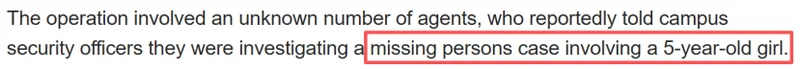 据报道,当时共有五名ICE执法人员“没有任何搜查令”。这些ICE的执法人员是通过“冒充”纽约警察局(NYPD)警员,并出示了一份伪造的关于5岁女童失踪的通告,才被允许进入校园宿舍。